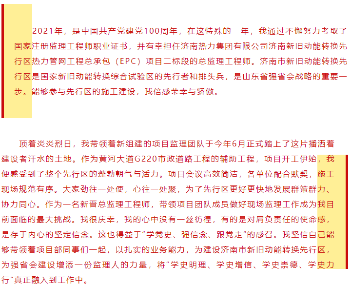 濟(jì)南監(jiān)理總監(jiān)理工程師于理耐奮斗事跡獲市直機關(guān)團(tuán)工委“學(xué)百年黨史 話青年擔(dān)當(dāng)”奮斗心聲活動展播